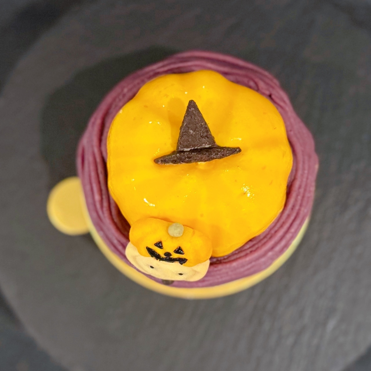 カボチャペーストのたっぷり入ったNYスタイルのチーズケーキの台にカボチャ型のパンプキンカスタードケーキをのせ、ハロウィンカラーの紫芋クリームを絞りました。