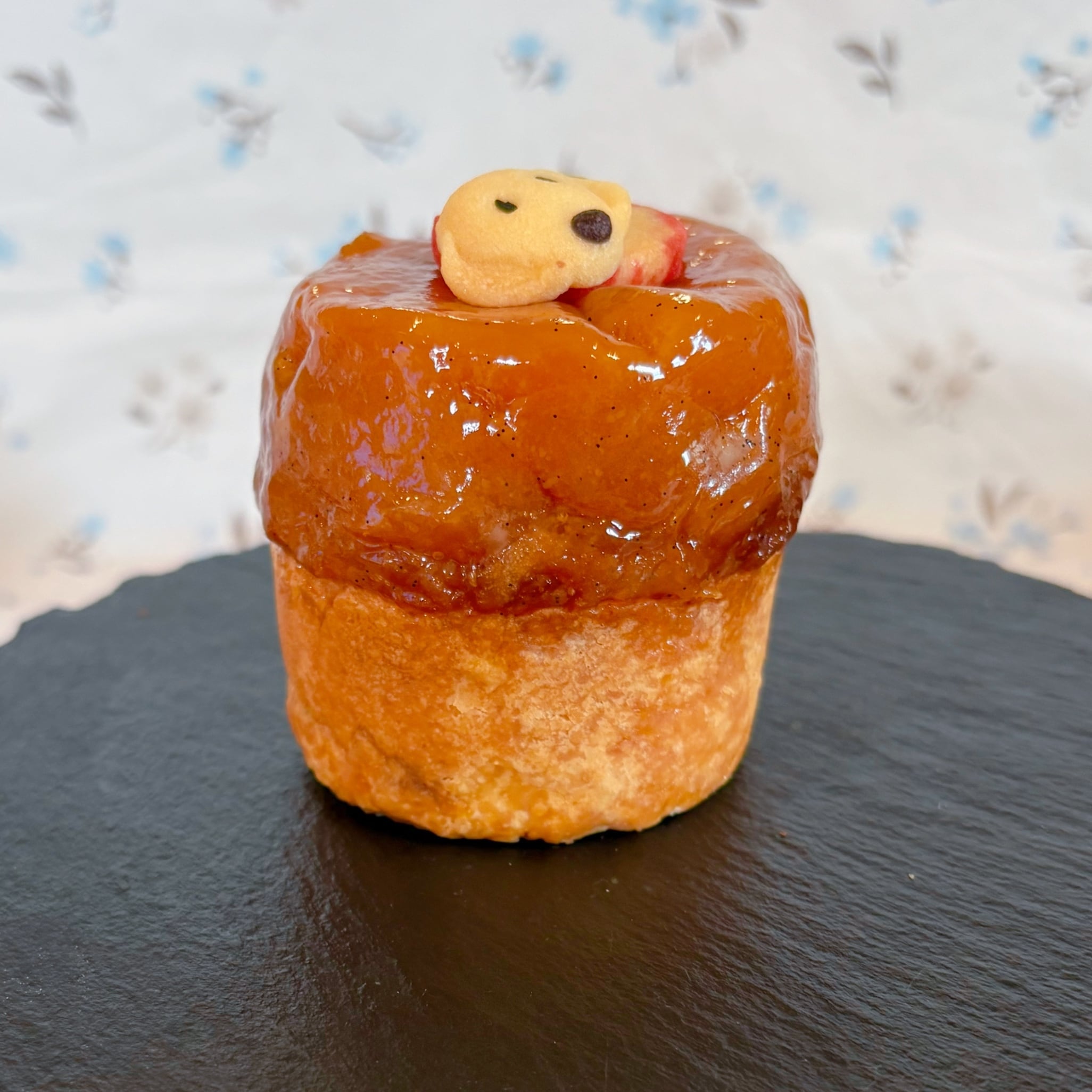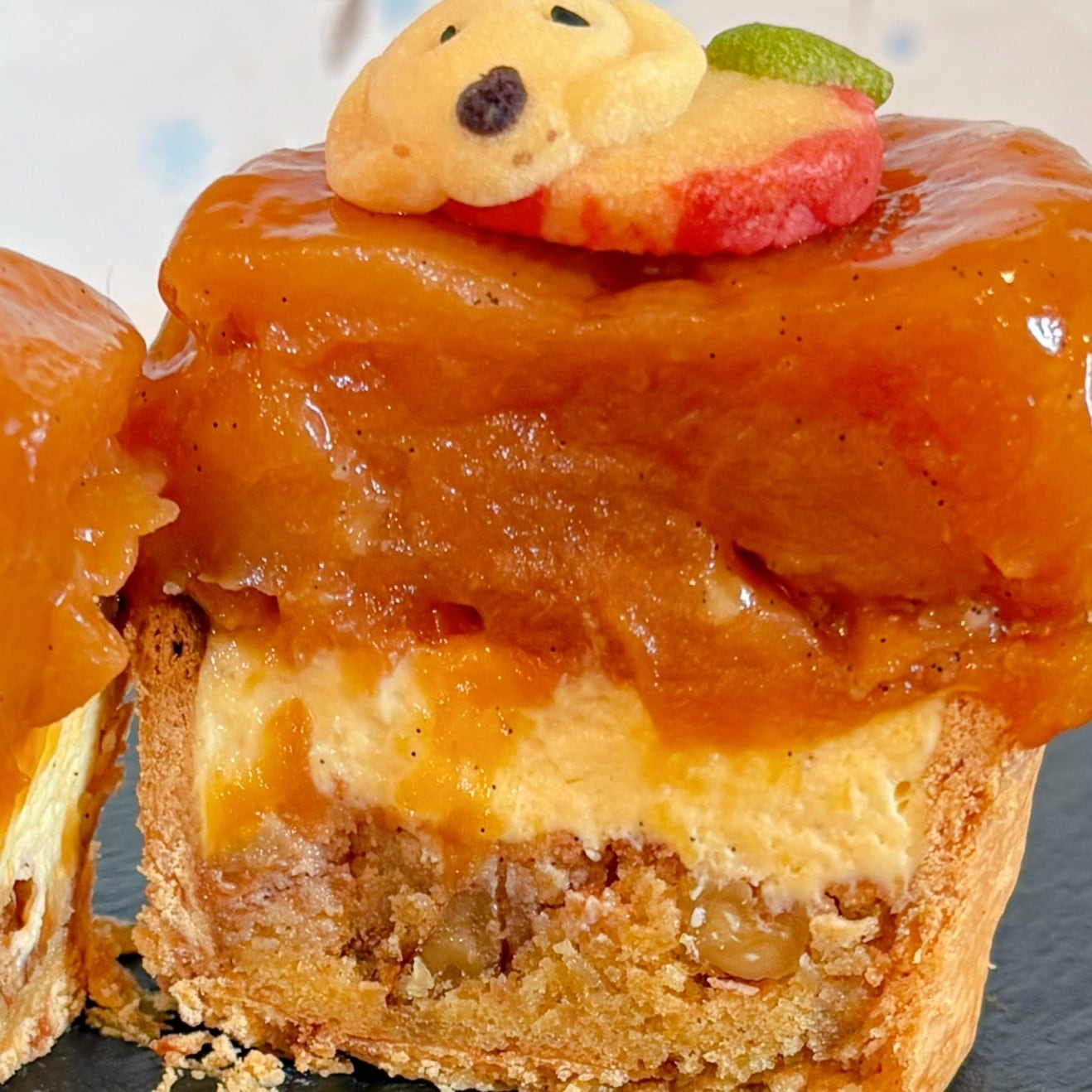 カスタードと生クリームを合わせたディプロマートクリームを絞りカラメル焼きりんごをのせ完成。