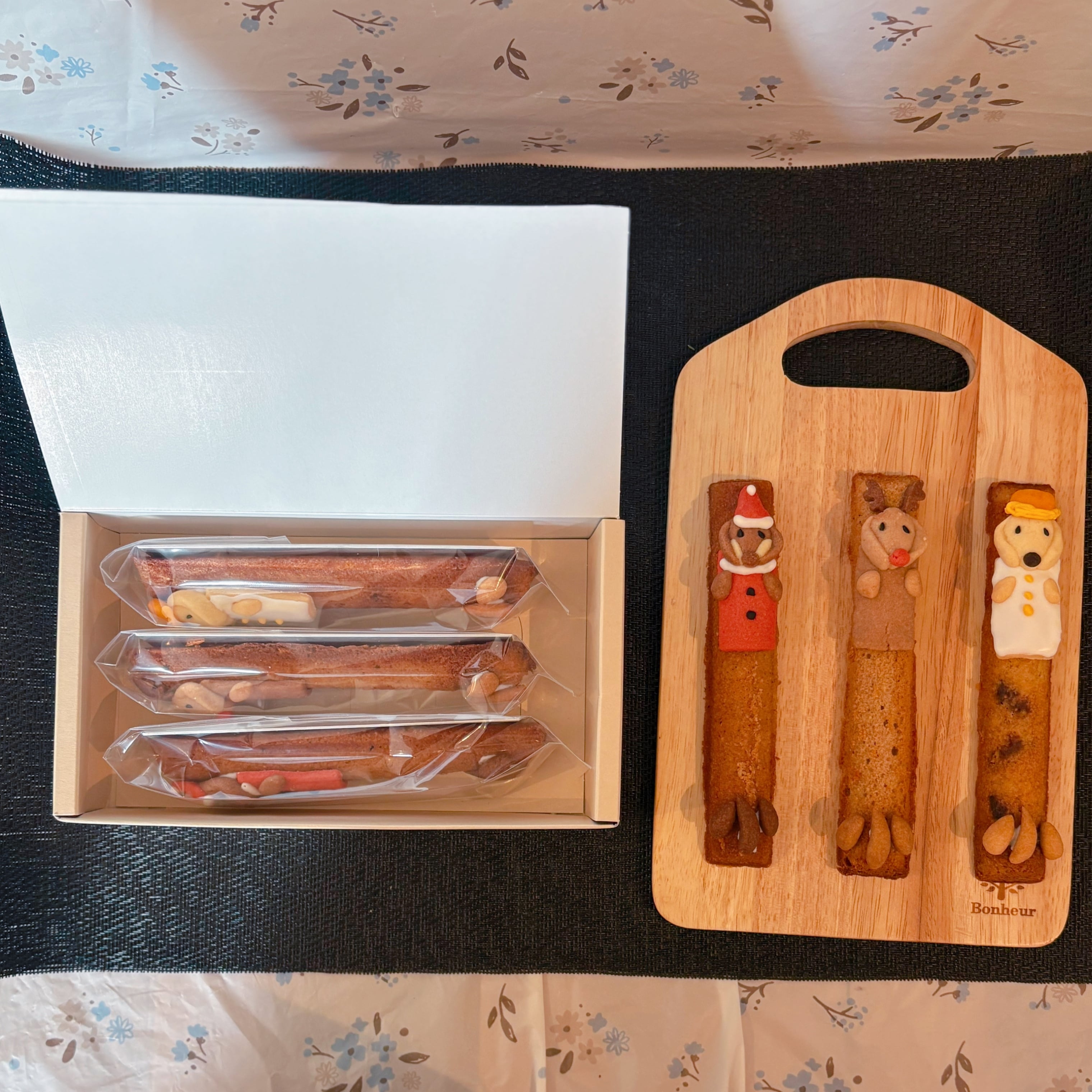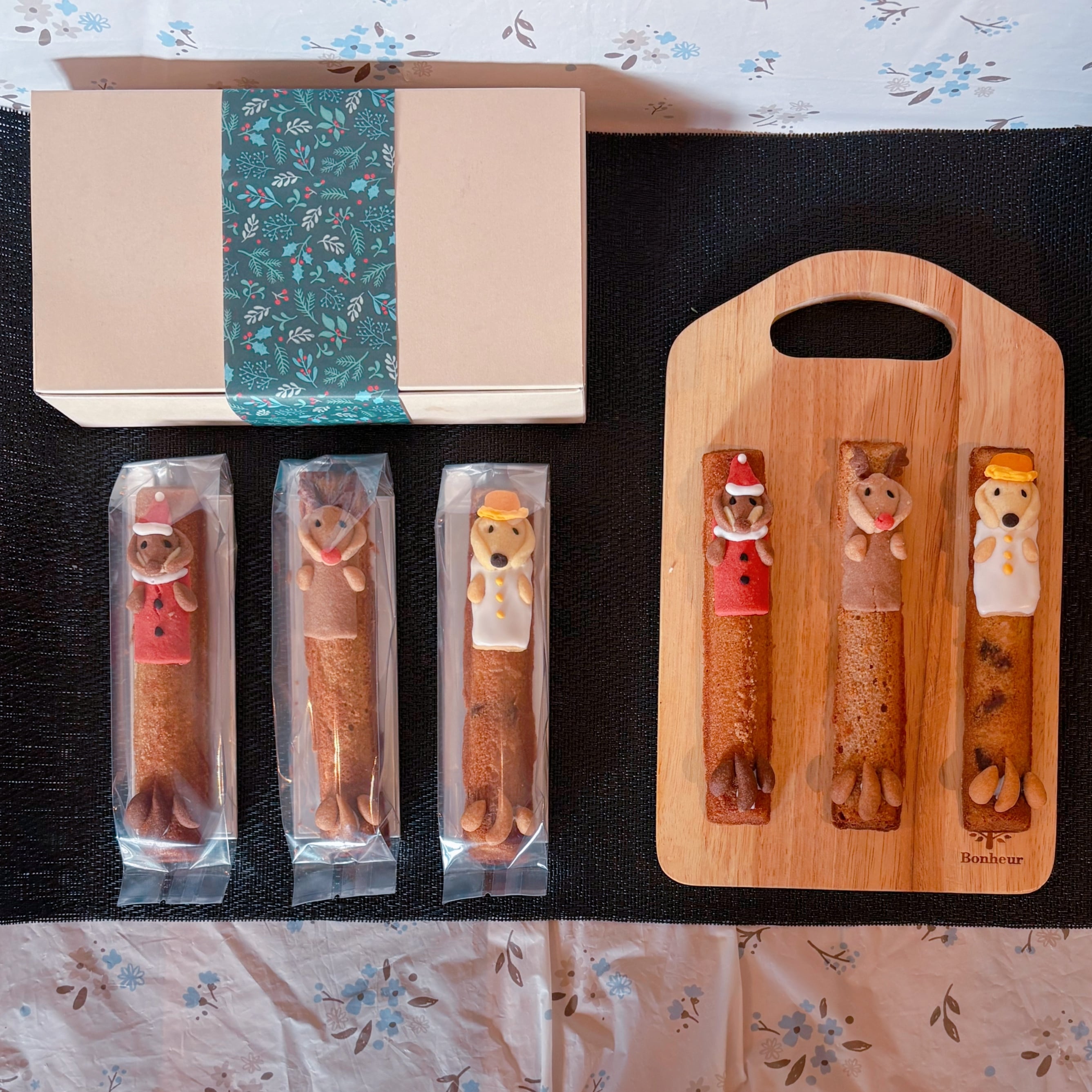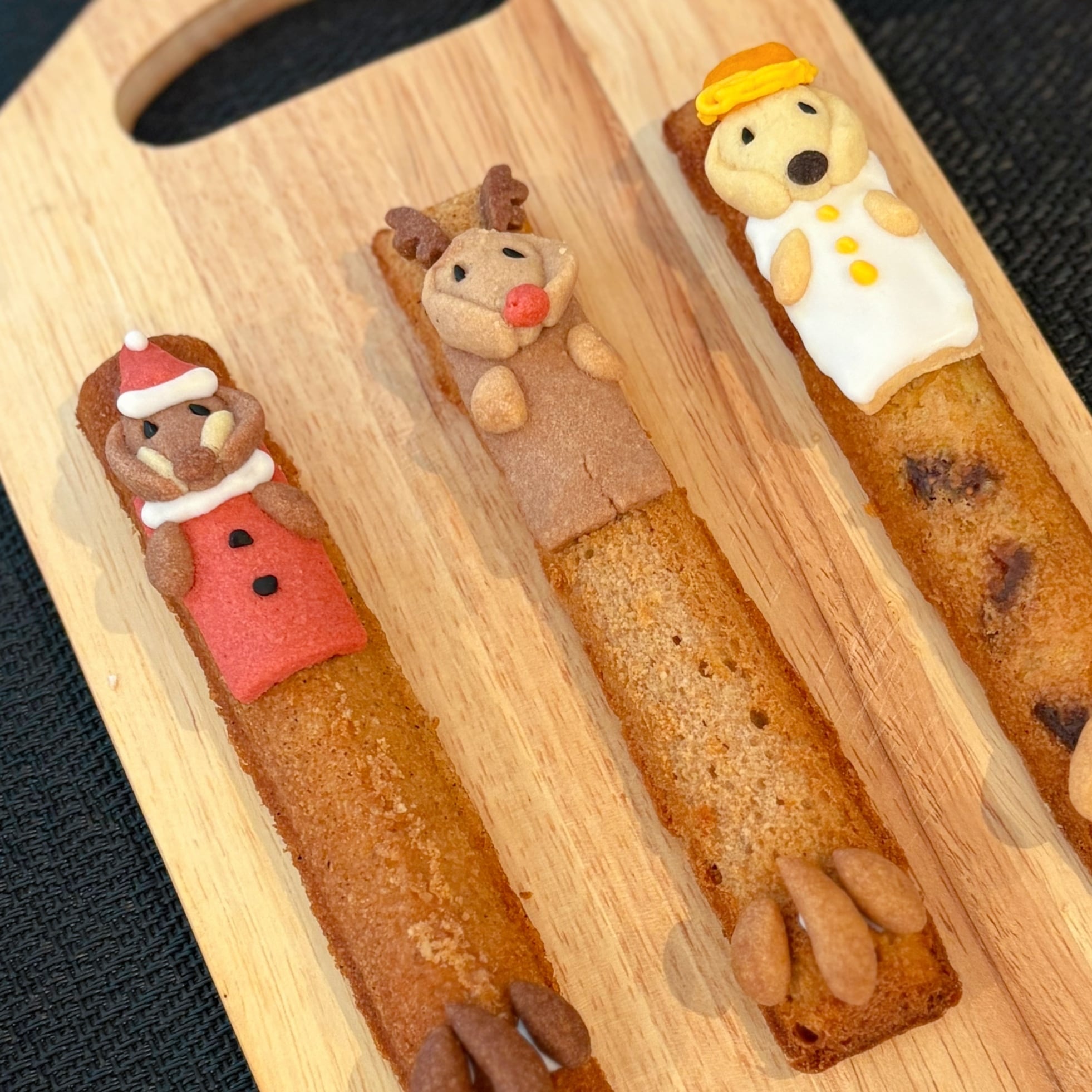 今回は3種のフィナンシェ生地でのスティックケーキです。 クリスマスらしく、サンタ、トナカイ、スノーマンに扮したダックスたちです。